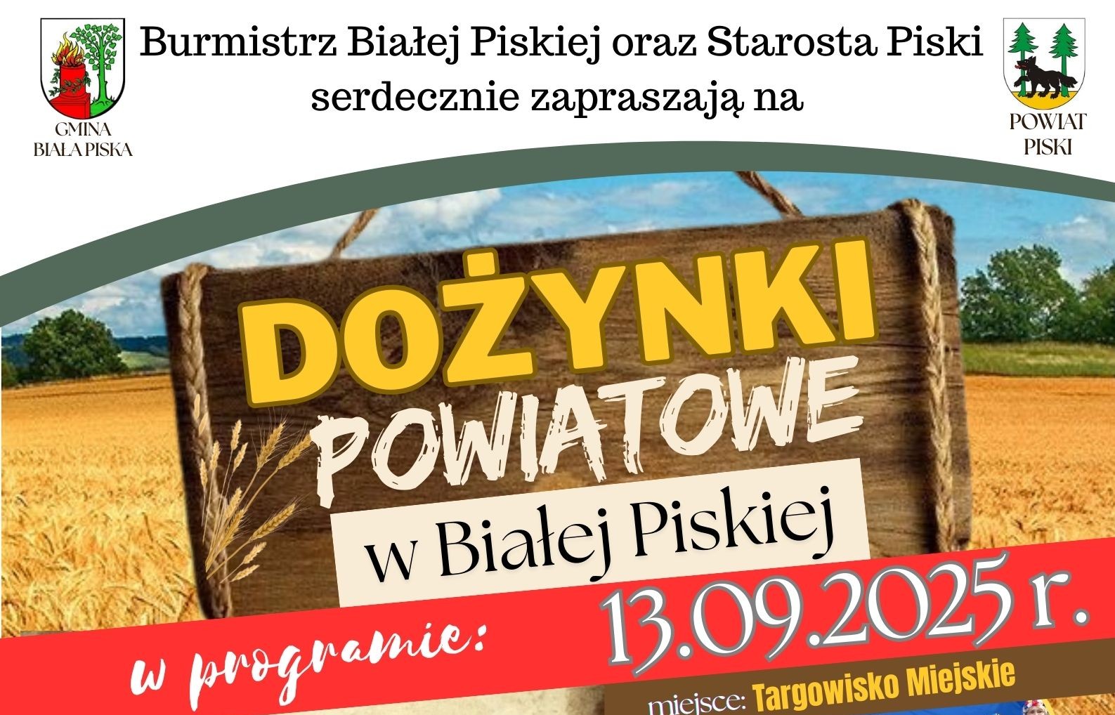 Gmina Biała Piska gospodarzem tegorocznych dożynek Powiatu Piskiego. Do udziału w Dożynkach Powiatowych 2025r. zapraszają Burmistrz Białej Piskiej i Starosta Piski.