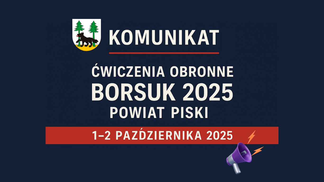 W dniach 1-2 października 2025 r. na terenie powiatu piskiego zostanie przeprowadzone powiatowe ćwiczenie obronne pod kryptonimem „BORSUK 2025”. Są to cykliczne ćwiczenia, organizowane co trzy lata zgodnie z harmonogramem opracowanym przez Wojewodę Warmińsko-Mazurskiego. Głównym celem działań jest sprawdzenie i doskonalenie współdziałania służb oraz administracji w sytuacjach zagrożenia.